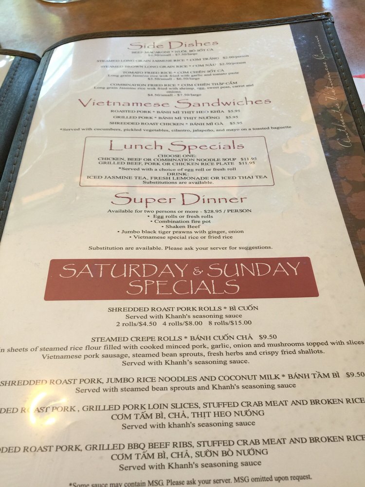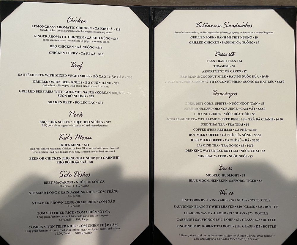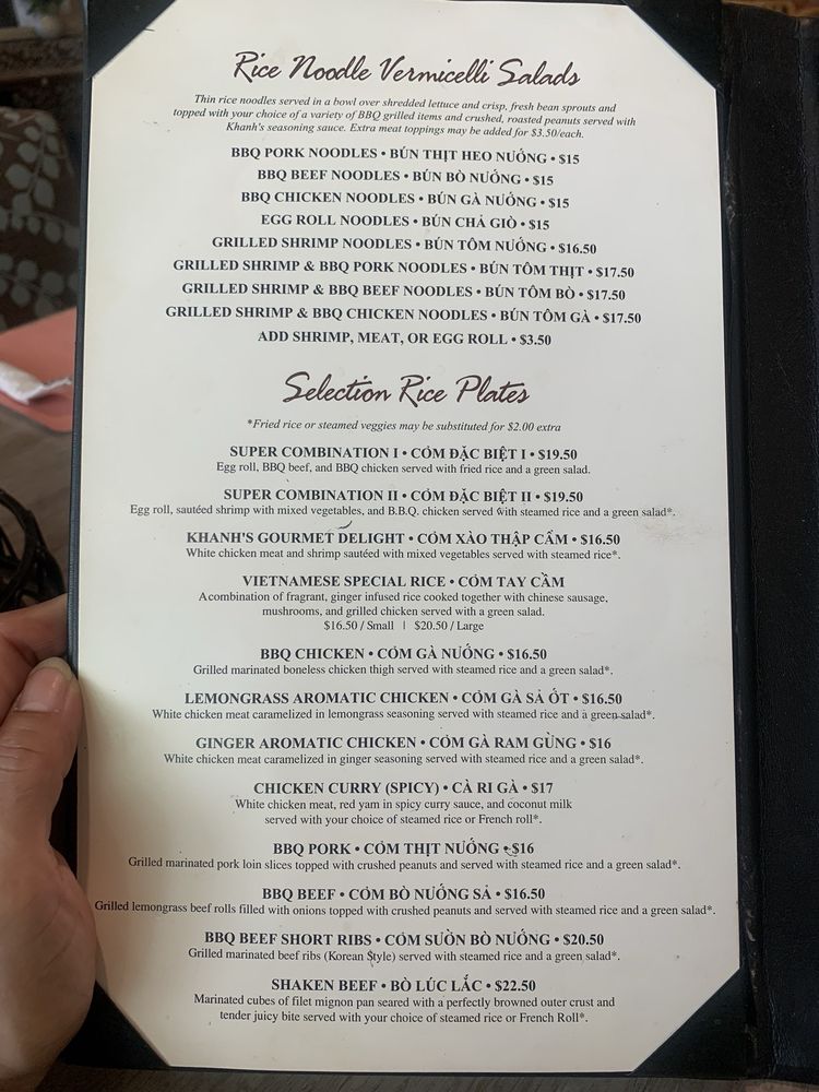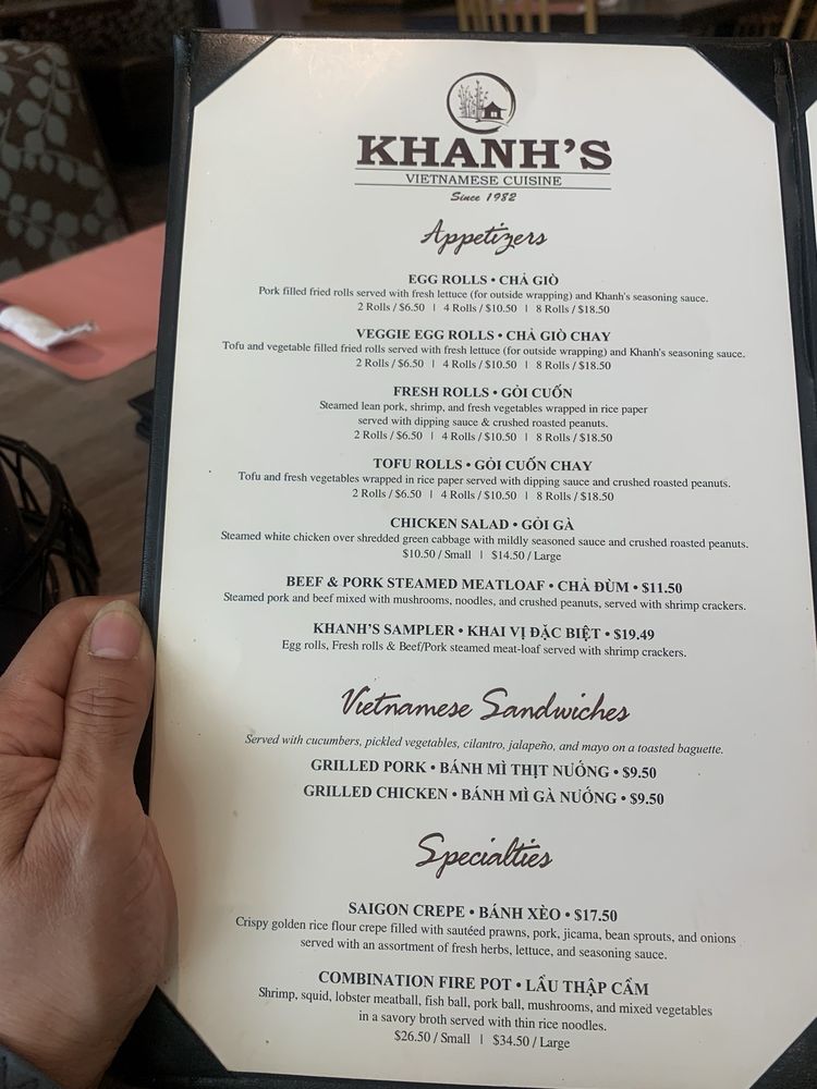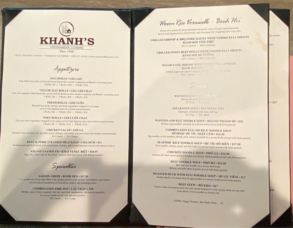 Introducing Khanh's Restaurant, a Vietnamese gem located in Campbell, CA. With a diverse menu ranging from appetizers like Egg Rolls and Fresh Rolls to Vietnamese Sandwiches and specialties like the Combination Fire Pot, Khanh's offers a unique dining experience. Customers rave about the friendly staff, generous portions, and delicious dishes, such as the lemongrass Tofu and Saigon Crepe. The charming interior with retro touches and a hidden garden adds to the dining experience. Must-try items include the grilled Pork Sandwich, BBQ Pork Slices, and Beef Stew. Whether you're a regular or visiting for the first time, Khanh's Restaurant promises a memorable and flavorful culinary journey.